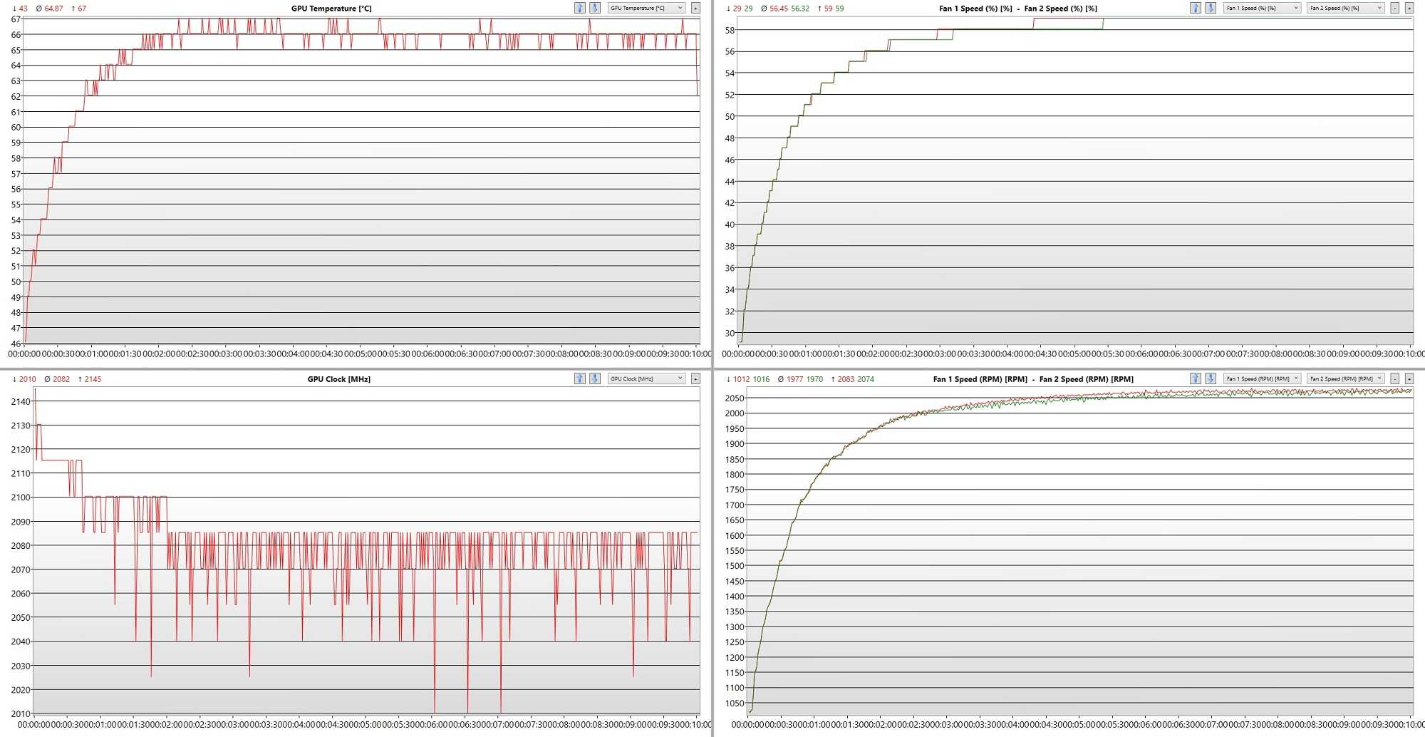 А вот максимальная температура GPU выросла до 65 °С, а средняя температура не изменилась. Зато немного снизилась скорость вращения вентиляторов — до 1750 об/мин.