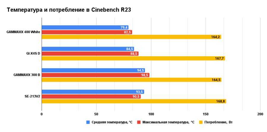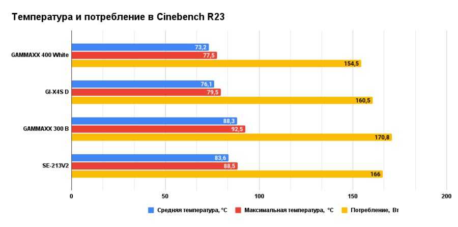 Cinebench R23 выступил в качестве самой ресурсоемкой нагрузки, поскольку во время выполнения бенчмарка рендерится 3D-сцена. В таком режиме процессор под DEEPCOOL GAMMAXX 300 B подошел к критической температуре и уходил в троттлинг. ID-Cooling SE-213V2 также был близок к предельной температуре, но успешно прошел этот тест. А вот лучшую среднюю температуру показал DEEPCOOL GAMMAXX 400 White.