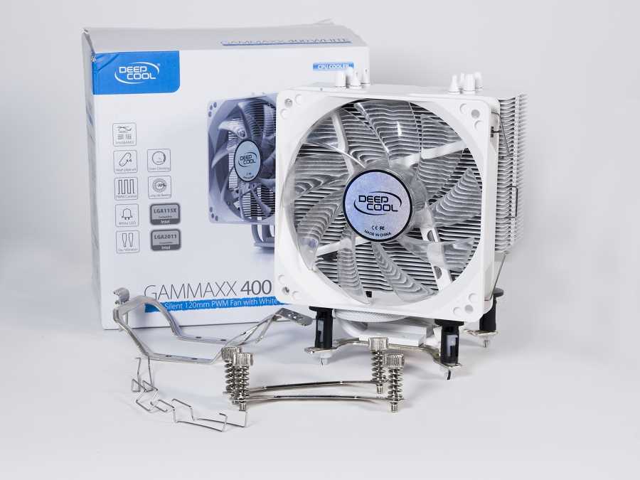 GAMMAXX 400 White собран на основе классического типа радиатора с четырьмя 6 мм медными тепловыми трубками и нанизанными на них алюминиевыми пластинами. Радиатор выкрашен в белую матовую краску. Основание кулера выполнено по технологии прямого контакта, когда тепловые трубки непосредственно контактируют с теплораспределительной крышкой процессора. Со стороны установки вентилятора приклеены антивибрационные прокладки. Установка кулера довольно таки легка, так как не требует демонтажа материнской платы в уже собранном корпусе. Средняя цена на момент публикации на данную модель составляет 2350 рублей и существует более дешевая версия с неокрашенным радиатором, его средняя цена будет на 500 рублей ниже.