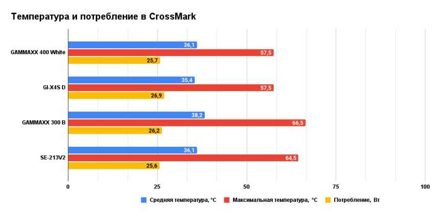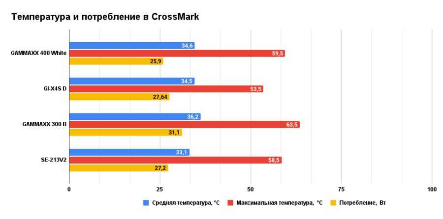 Crossmark — это новый бенчмарк для комплексного тестирования ПК. В нем оценивается производительность при выполнении повседневных задач. В Crossmark самая низкая температура так же у кулера PCCooler GI-X4S D. В прочем, и с другими системами охлаждения температура крайне далека от предельных значений.