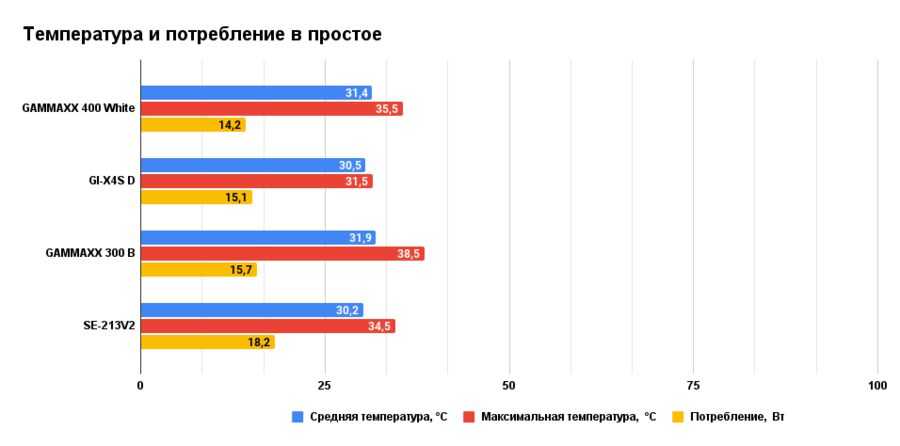 Тест в режиме простоя включал в себя открытый рабочий стол и выполнение фоновых процессов в течении 15 минут, который показал, что системы с четырьмя тепловыми трубками имеют немного меньшую температуру. PCCooler GI-X4S D выступил лидером в этом тесте.