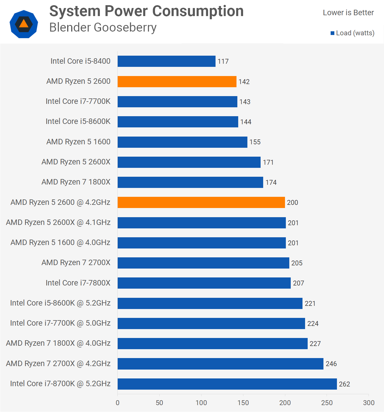 Здесь мы видим с рабочей нагрузкой Blender, 2600 потребляет меньше энергии, чем 1600, и снова разогнан все еще потребляет меньше, чем Core i7-7800X.