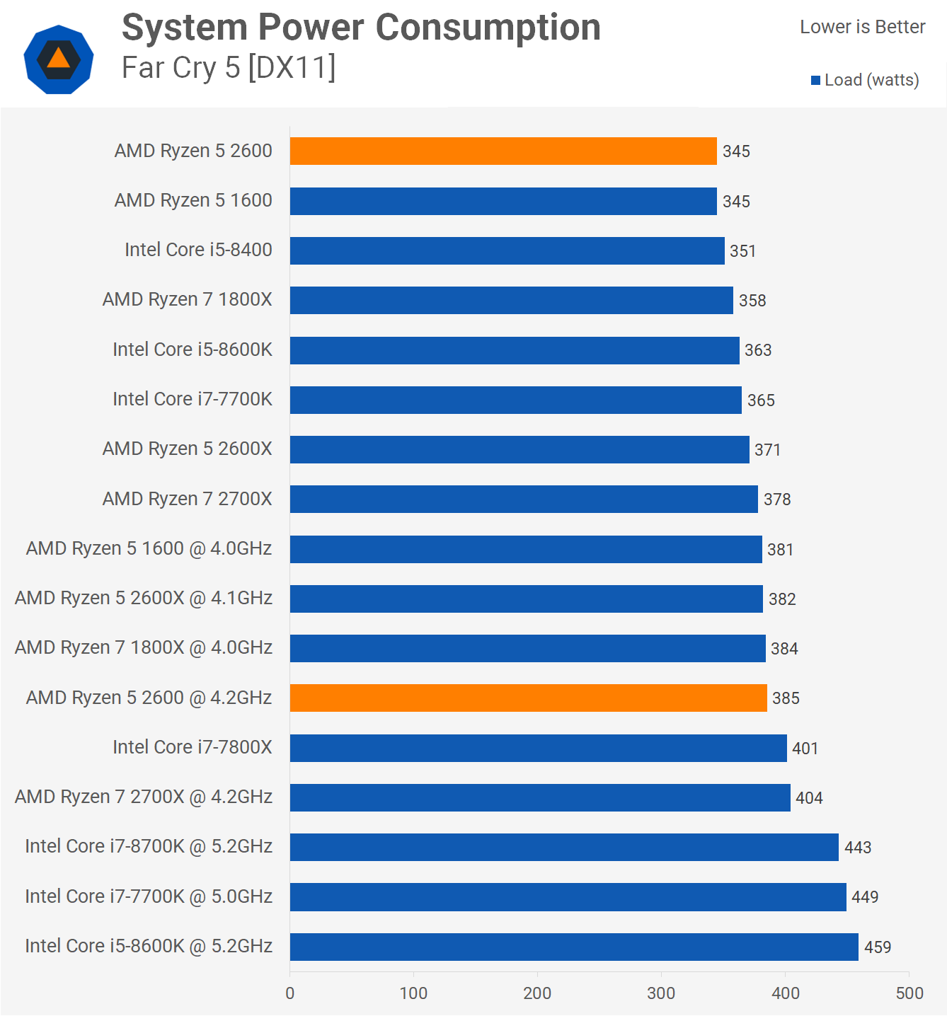 2600 снова совпал с Ryzen 5 1600, на этот раз составив 345 ватт, и мы видим увеличение на 12% после разгона, которое по-прежнему меньше, чем количество энергии, которую выигрывает 7800X.
