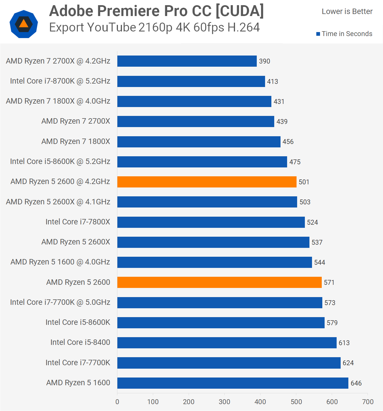 Наконец, мы получили результаты Premiere Encode, и здесь разогнанный 2600 увеличил общее потребление системы всего на 28%. Учитывая, что 8600K увеличилось на 32% после разгона, это достойный результат для 2-го поколения Ryzen CPU.