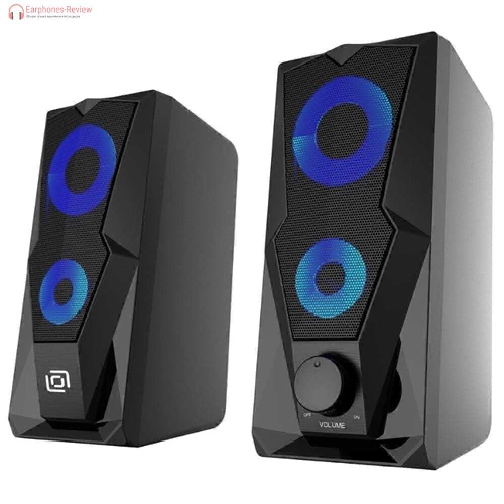 OK-127 – комплект однополосных колонок от бренда, принадлежащего британской компании Nippon Klick Systems LLP. Трапециевидные пластиковые корпуса исполнены в классическом черном цвете. Дизайн оживляет фигурный сегмент лицевой панели и разноцветная подсветка динамиков. Для ее включения/выключения нужно нажать на верхнюю часть защитной сетки, а яркость регулируется удержанием руки.