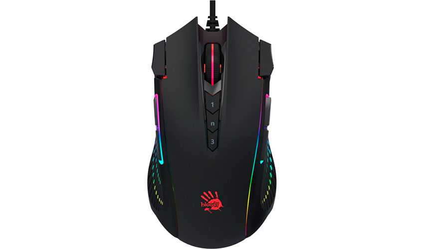 В отличие от предыдущей модели, эта мышь имеет полностью симметричный корпус и более уточненный дизайн. На месте нижнего колесика размещен вертикальный ряд кнопок, а подсветка более сбалансирована и выглядит действительно гармонично. Цена A4 Tech Bloody J90s – 2100 рублей.