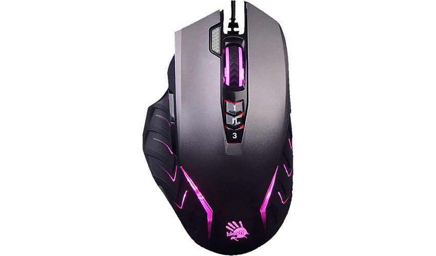 Переходим к ультра-бюджетному сегменту. Эта модель Bloody имеет оптический светодиодный сенсор на 10 000 DPI, скромную, но яркую подсветку и эргономичную (для правой руки) форму. Пользователи отмечают, что им нравятся материалы корпуса и качество сенсора. Также они в восторге от удобных кнопок на дне мышки, которые позволяют тонко настроить герцовку, DPI и другие параметры.