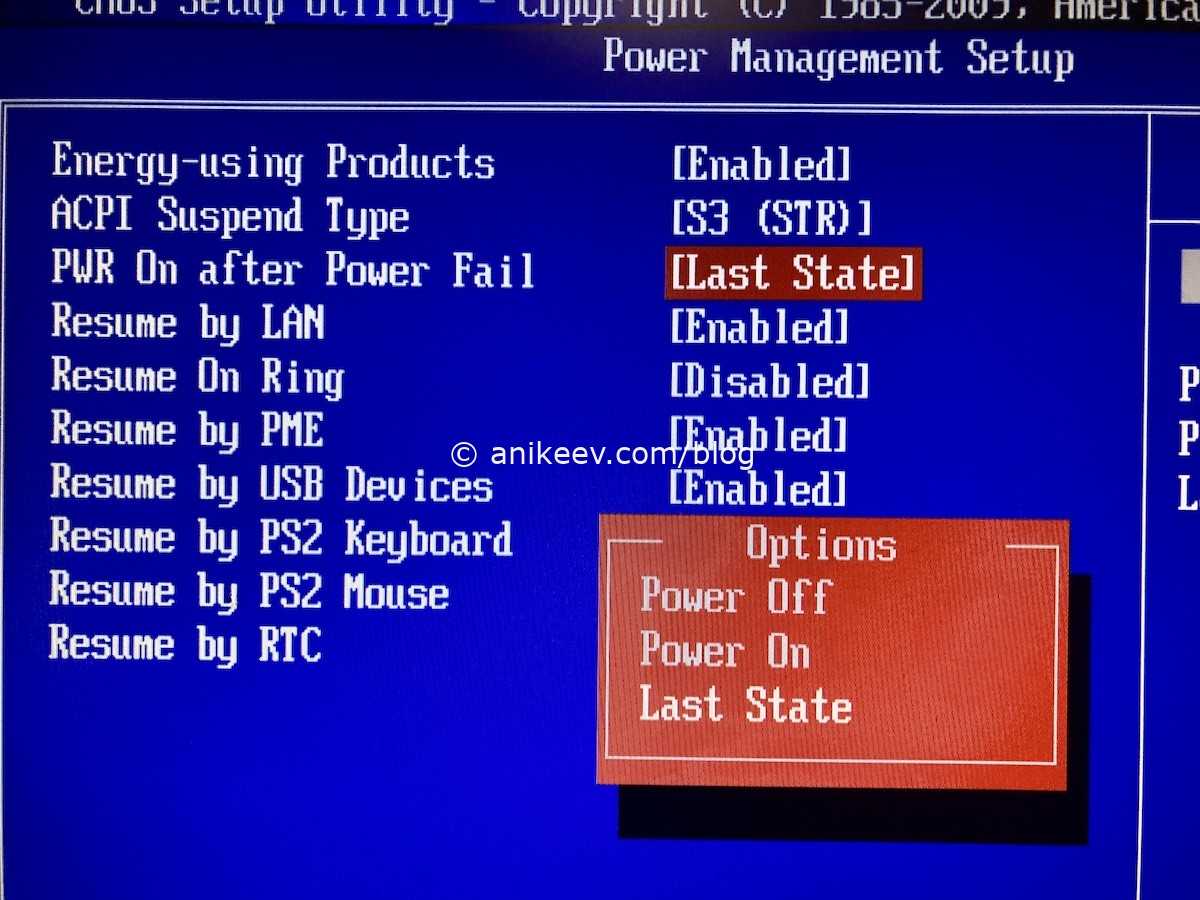 Restore on AC power loss = Power on — параметр Restore on AC power loss задаёт поведение компьютера при подаче электропитания после отключения. В нашем случае нужно выставить Power on, чтобы самосборный NAS включался сам после отключения электроэнергии и при её возвращении. Как вариант можно выбрать опцию Last state, что переводится «делай, как было». Это удобный вариант для редкоиспользуемых сетевых хранилищ: в случае установки значения Last state NAS включится после перебоя с энергией только если и до него он работал, а если был выключен — так выключенным и останется.