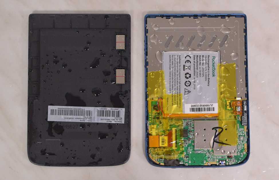 В PocketBook 632 Aqua разработчики пошли по другому пути. Здесь все компоненты платы заботливо покрыты гелем HZO, который защищает электронику от выхода из строя в случае попадания воды. В результате присутствие водозащиты никак не влияет на дизайн электронной книги, модель выглядит как обычный ридер.