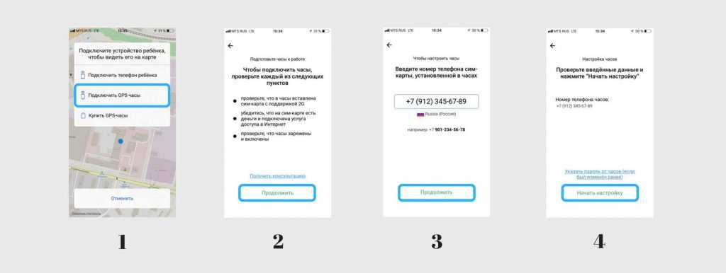 На экране добавления ребёнка выбираем пункт «Подключить GPS-часы». На следующем экране внимательно читаем чек-лист, отмечаем про себя выполнение всех его пунктов. Нажимаем Продолжить. Вводим номер телефона часов и нажимаем Продолжить. На следующем экране нажимаем Начать настройку.