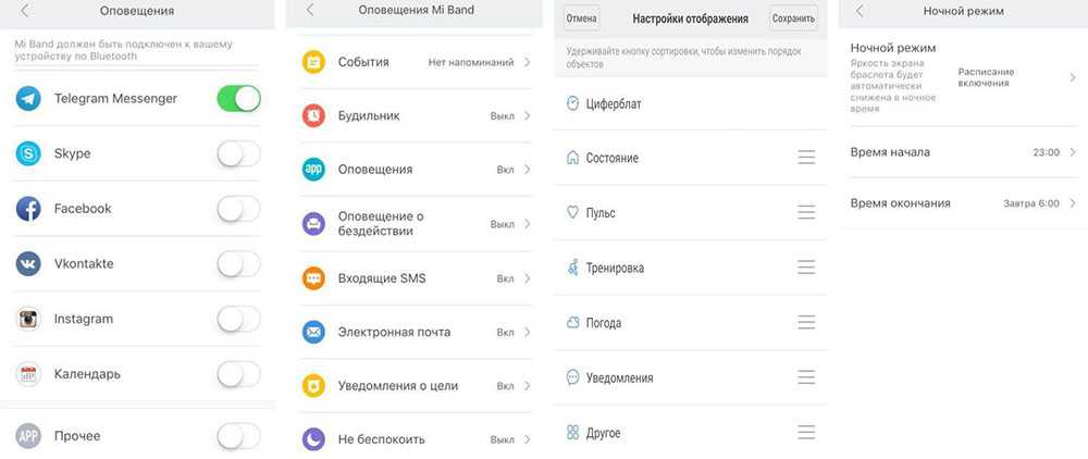 Настройка параметров доступна в разделе «Уведомления», где можно настроить оповещения на браслет о входящем вызове на телефон (трекер завибрирует и высветится имя звонящего), смс (появится имя отправителя и часть текста), уведомлениях из приложений и т. д. Есть также возможность настройки часов, когда уведомления не потревожат.