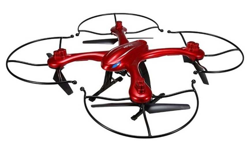 Квадрокоптер Х-образной формы выполнен из прочного пластика с лаковым покрытием красного цвета. Камера не входит в базовый комплект поставки. Беспилотник оснащён подвесом для крепления разных моделей современных экшен-камер. Для управления дроном с мобильного устройства используют специальное ПО, скачиваемое с сайта производителя. В комплекте удобный пульт ДУ с креплением для смартфона. Надёжная связь через 4-канальный передатчик позволяет летать на расстояния до 100 метров. Выносная батарея ёмкостью 1200 мАч. Хватает на полёт в течение 11 мин. Зарядка длится 3 часа.