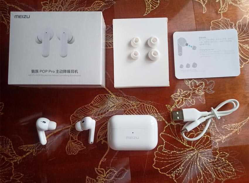 Комплектация стандартная – такая же, как у большинства беспроводных наушников из соответствующего ценового сегмента. В комплект входят непосредственно гарнитура Meizu Pop Pro, три пары амбушюр (одна надета, две сменные), зарядный кабель для кейса (разъем USB-C) и инструкция пользователя.