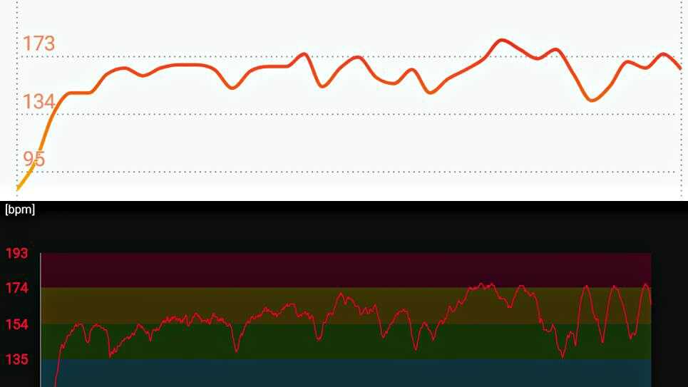 На графике ниже вы видите сравнение работы датчика пульса Gear Sport и грудного пульсометра Polar H7. В основном, данные совпадают, однако девайс от Samsung не улавливает резкие перепады пульса. Также, в процессе бега расхождение показаний составило около 10 ударов в минуту. Хотя, если не разгоняться, бежать примерно на одной скорости и по ровной местности (без холмов, горок, спадов), то датчик пульса Gear Sport работает относительно точно.