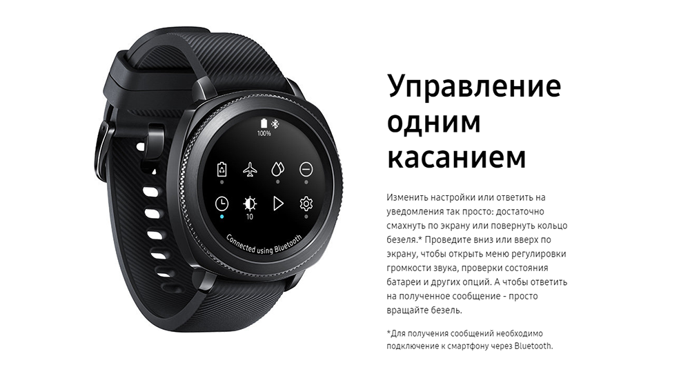 У фирменной операционной системы Samsung Tizen простой и удобный интерфейс. Поклонникам Android Wear не стоит переживать — Tizen тоже позволяет взаимодействовать со всеми уведомлениями. Для этого, нажмите на его, чтобы прочитать целиком или выбрать вариант действия. Если провести пальцем вверх по экрану, уведомление моментально исчезнет — не только на часах, но и на смартфоне.