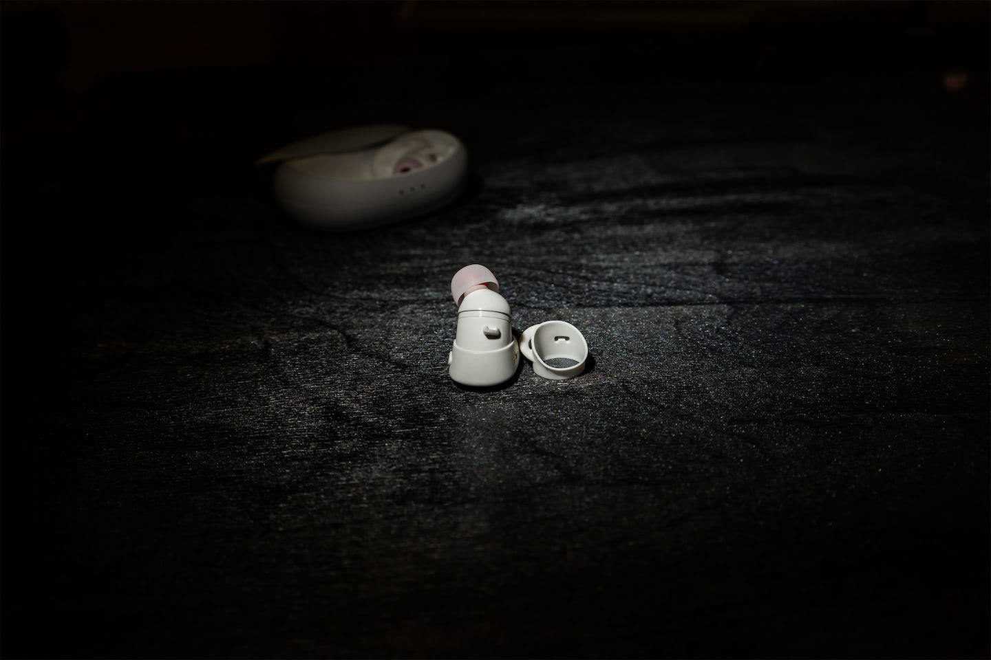 Наушники. Корпусы внушительных размеров. Средние или больше средних по меркам современных TWS. Они тоже пластиковые: наружная сторона с вставкой «под металл», остальная часть корпуса того же цвета, что и кейс. Поверхности матовые, отпечатки пальцев на них не задерживаются. На верхнем торце каждого наушника расположена одна кнопка. Из ушей они выступают достаточно далеко, но не смотрятся совсем громоздко. Выглядят и в ушах, и на столе интересно: отличаются от конкурентов, но без перегибов в плане дизайна.