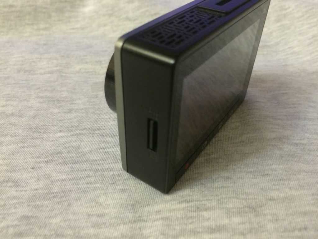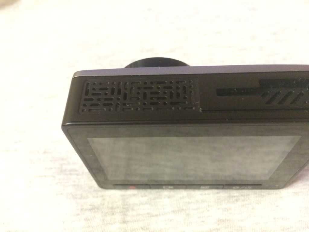 Вот так регистратор выглядит спереди. Объектив и небольшое отверстие микрофона под ним. Темно-серая передняя панель слишком заметна, но в качестве альтернативы доступна только еще более приметная бело-золотистая расцветка регистратора.
