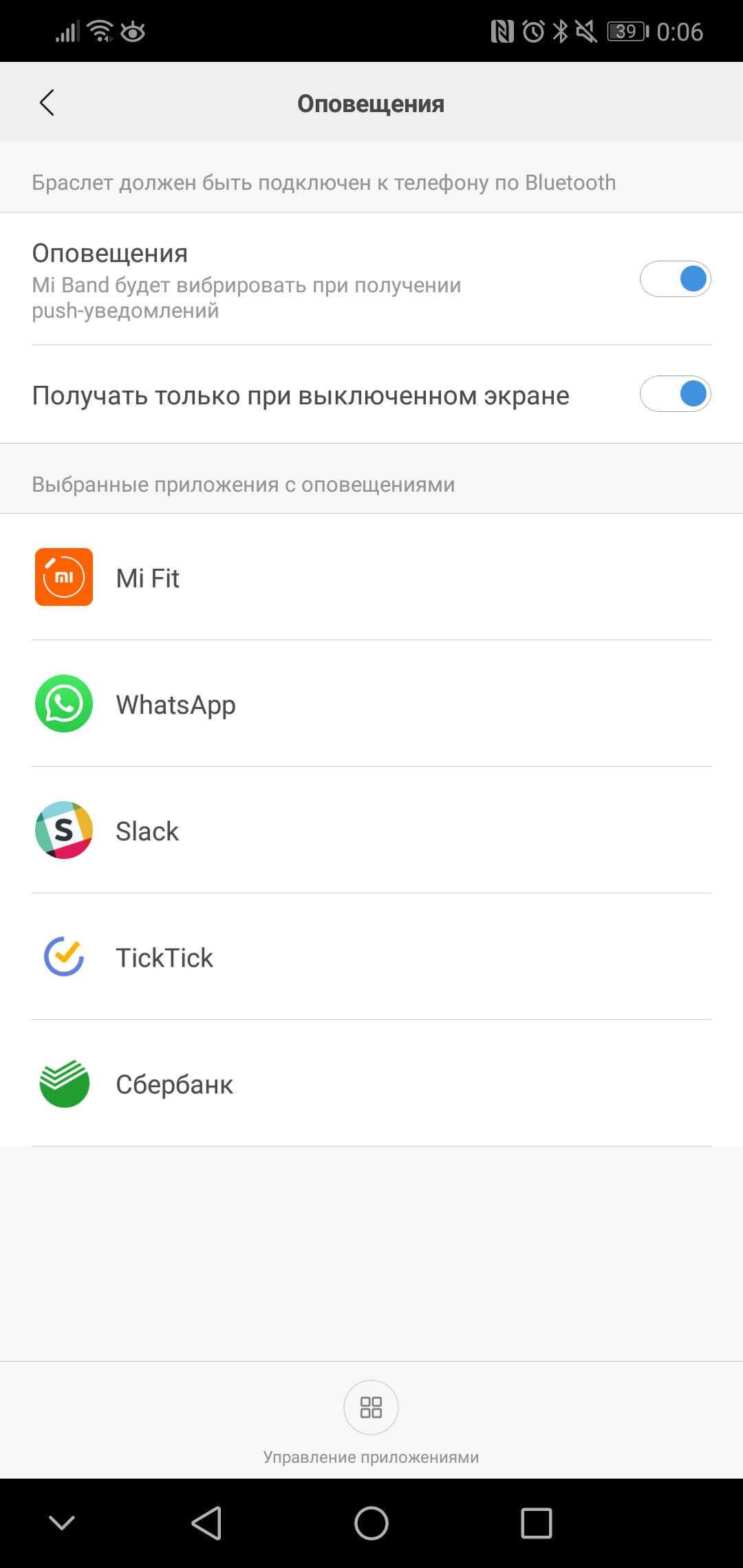 Оповещения: в данном разделе вы можете настроить уведомления из мобильных клиентов социальных сетей, мессенджеров и других установленных приложений. Нажмите на кнопку “Управление приложениями”, и просто отметьте галочками необходимые приложения. После этого, уведомления из этих приложений будут выводиться непосредственно на экране браслета Mi Band 3, а в случае с Mi Band 2 появится либо уникальная иконка приложения (WhatsApp), либо стандартная иконка, сигнализирующая о поступлении нового уведомления.