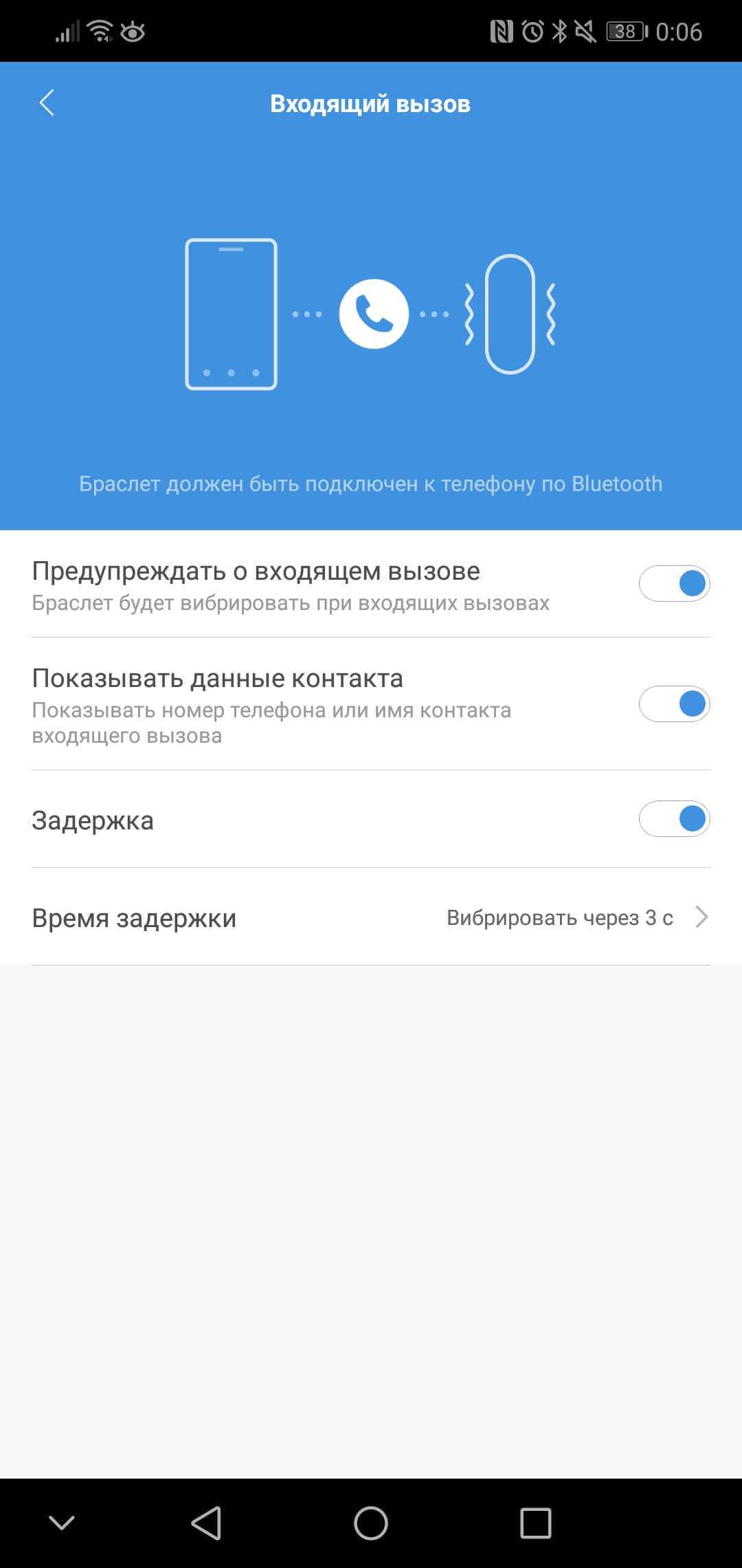 Входящий вызов: после активации данной функции появится запрос доступа к функциям смартфона — просто подтвердите запрос. Затем вы сможете настроить дополнительные параметры: Показывать данные контакта (показывает имя звонящего на экране Mi Band) и Отложить уведомления (браслет начинает вибрировать спустя некоторое время после поступления вызова — от 3 до 30 секунд).