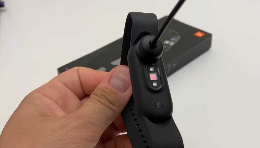Прежде чем начать настройку фитнесс-трекера, нужно зарядить Mi Band 5. В отличие от предыдущей версии, доставать капсулу из ремешка не требуется. В комплект входит магнитное зарядное устройство и кабель. Магнитную пластину необходимо приложить к контактам на обратной стороне капсулы, а шнур соединить с USB розетки, компьютера или использовать Power Bank. Полная зарядка необходима для предотвращения сбоев в процессе сопряжения браслета с телефоном через приложение Mi Fit.