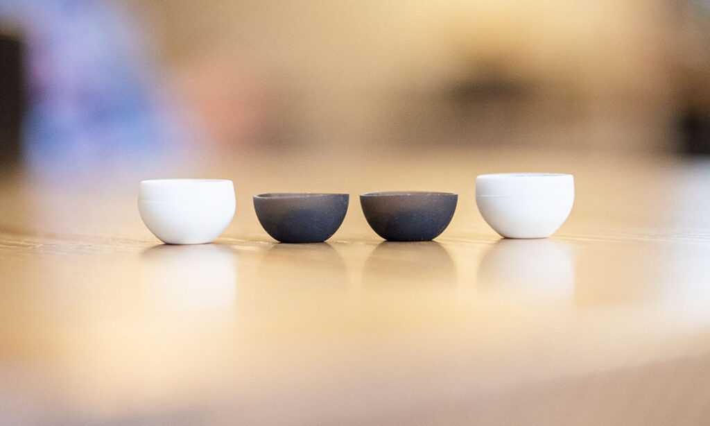 Сами гарнитуры располагаются вертикально, держатся при помощи магнитов и даже в перевернутом состоянии не выпадают из футляра. Между ними находится физическая кнопка, которая активирует режим сопряжения.