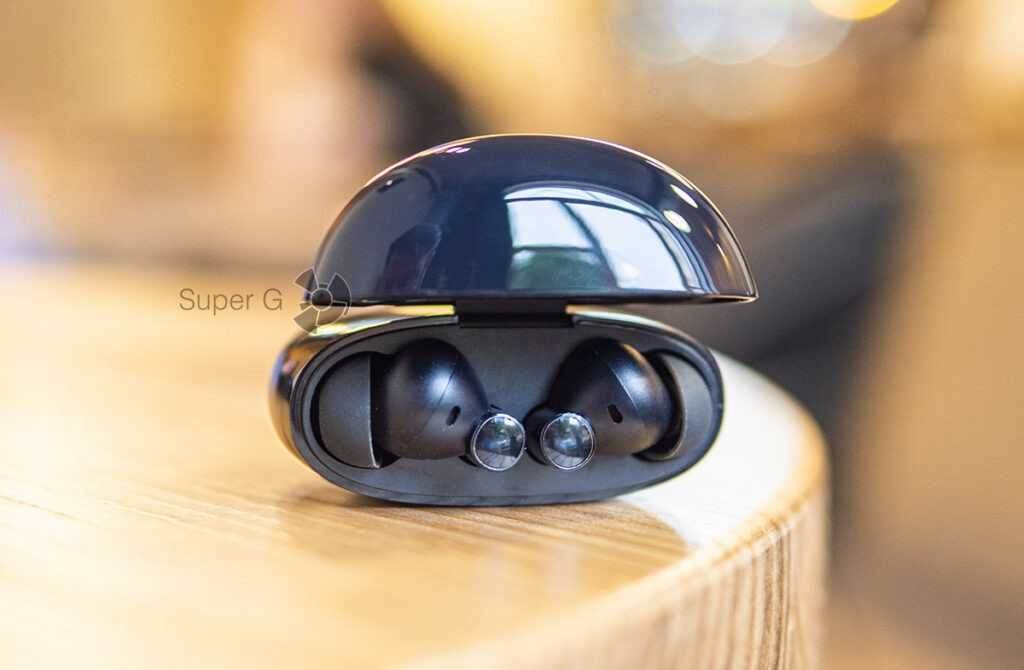 На корпусе кейса присутствует физическая кнопка для управления режимом сопряжения, световой индикатор заряда и порт USB-C. Наушники располагаются вертикально, а значит вытаскивать их придётся за «голову». Учитывая покатую форму ушек, к процессу извлечения придётся приноровиться: палец то и дело норовит соскользнуть при неправильном хвате. Крышка запирается на магнитный замок и лишь слегка люфтит в открытом состоянии.