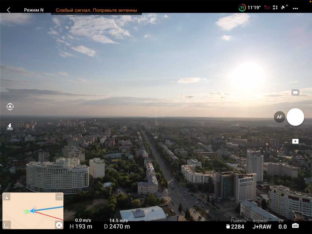 Режим CE. Взлет за городом, общее удаление ~2500 метров, из них пролет по городу примерно 500 метров. Сигнал рвется, дальше лететь невозможно.