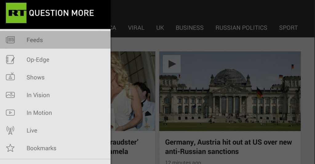 В вышеописанных программах для просмотра ТВ на андроид тоже есть РТ, но исключительно в русской версии. Собственное приложение RT позволяет просматривать программы и новости на нескольких языках. Это удобно для изучения языка. Англоязычные дикторы на RT обладают безупречным произношением.