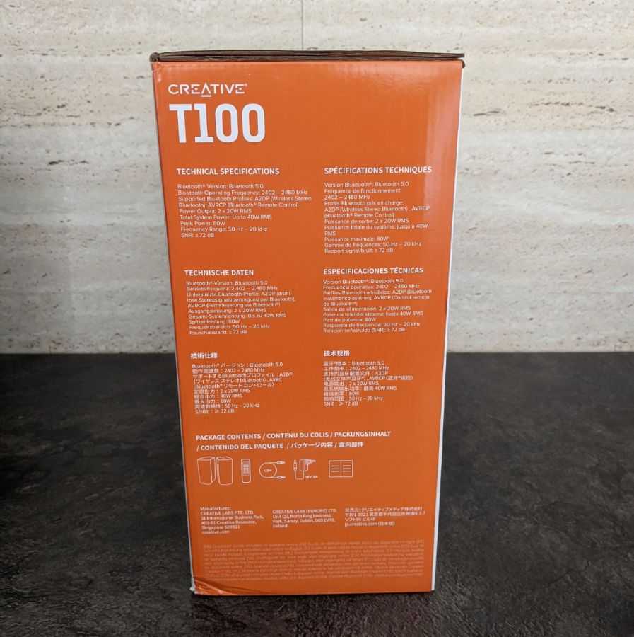 Its box sports a clean and simple theme. The front displays an image of the speakers, while “Creative” is on the upper left corner of the package. On the lower left portion, the name of the unit, T100, can be found.