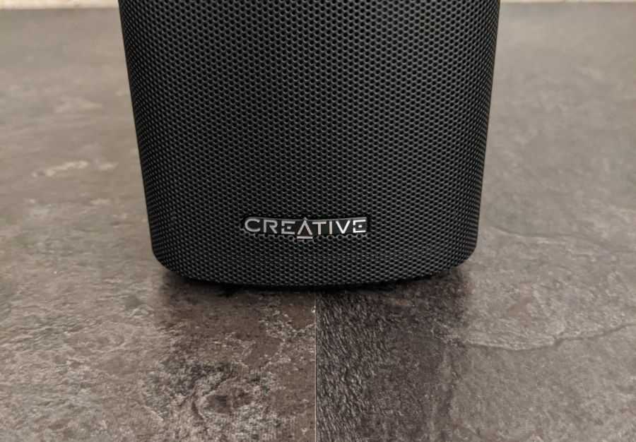 By looking at the T100, you can tell that it sports a minimalist design similar to Creative’s Stage Air. The speaker’s drivers are protected by black grills featuring a silver logo of Creative at the base.