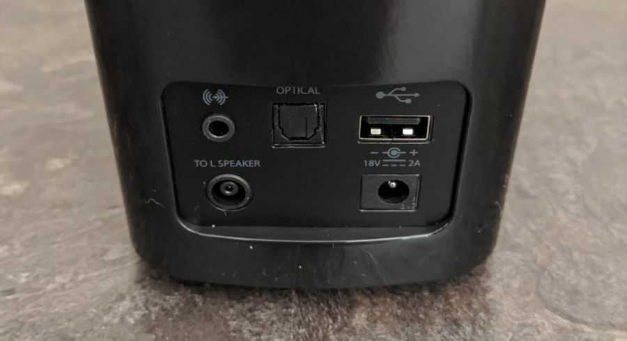 The top of the right speaker has three buttons. The first is for selecting the input source, the second is for raising and lowering the volume, and finally, the bottom one is for turning the speakers on or off. The back of the right speaker houses all the inputs as well. There are ports for power, 3.5mm audio, optical audio, USB mass storage, and left speaker connection. The back of the left speaker has an attached cable that connects to the right speaker. In addition, the back of each speaker has a rectangular cone near the top. Finally, the bottom of each speaker has four rubber-like pads near each corner.