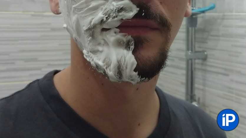 Первая часть эксперимента: половина лица на сухую, половина — с гелем. Нормальный режим, судя по всему, подойдет только для суточной щетины — неприятно.