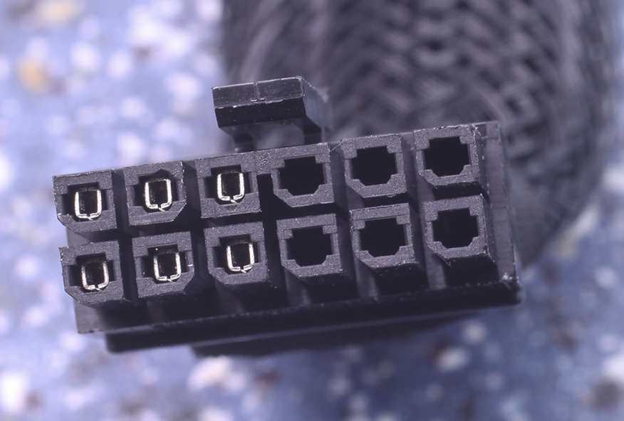 На 12-контактном адаптере крупным планом видно, что заполнена только половина его контактов. Это гарантирует, что на RTX 3080/3090 этот адаптер не будет работать, поскольку для этих карт требуется питание на всех контактах.