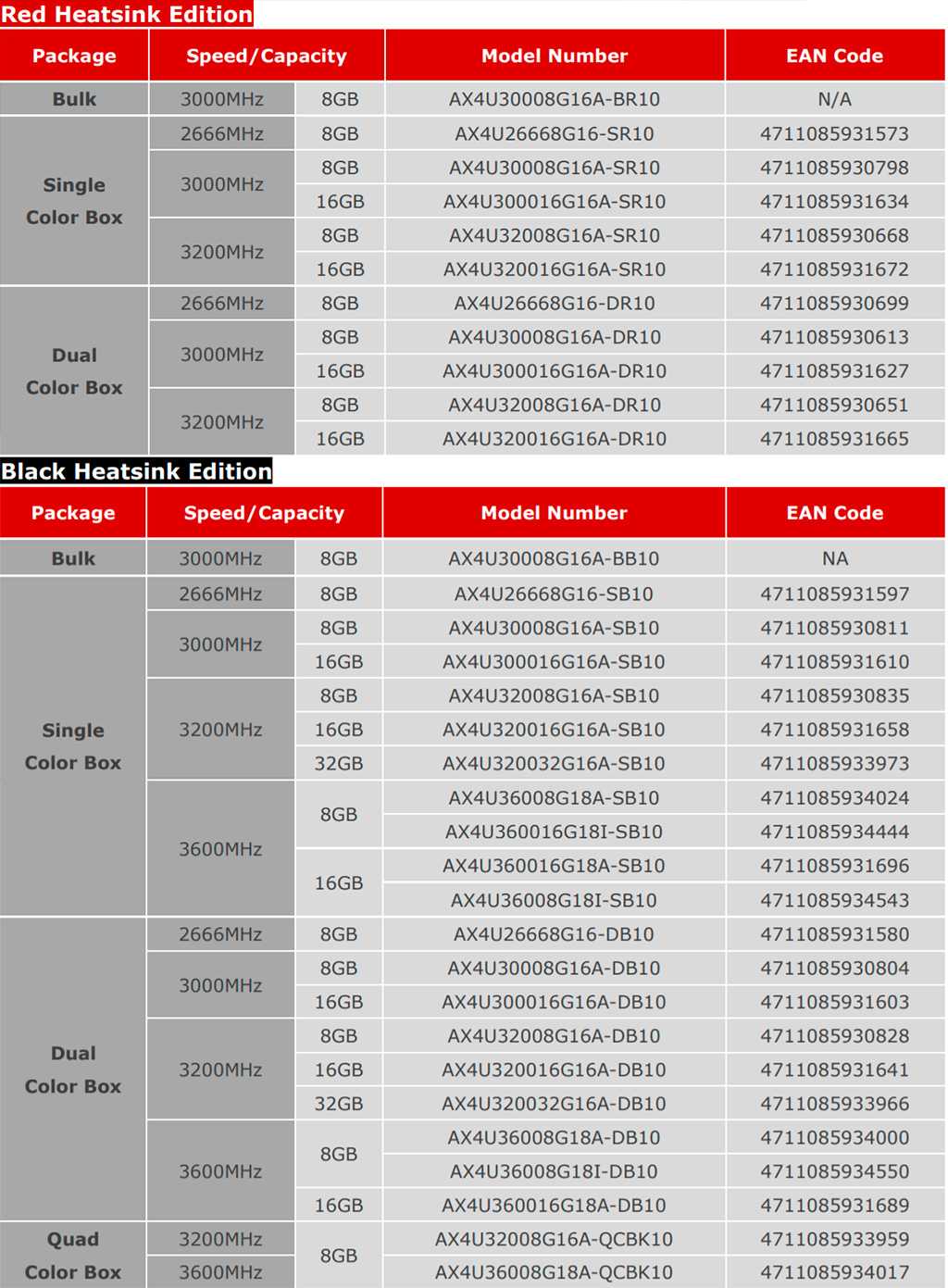 Как уже было сказано, производитель позаботился, чтобы у пользователей была масса возможностей в выборе модуля себе по душе, поэтому серия XPG Spectrix D41 представлена в более чем 30 вариациях. Поясню, что это число получено не столько большим спектром варьирующихся характеристик, сколько удвоением за счёт того, что каждый модуль может быть поставлен нескольких цветовых гаммах. С данными вариациами вы можете ознакомиться на сайте.
