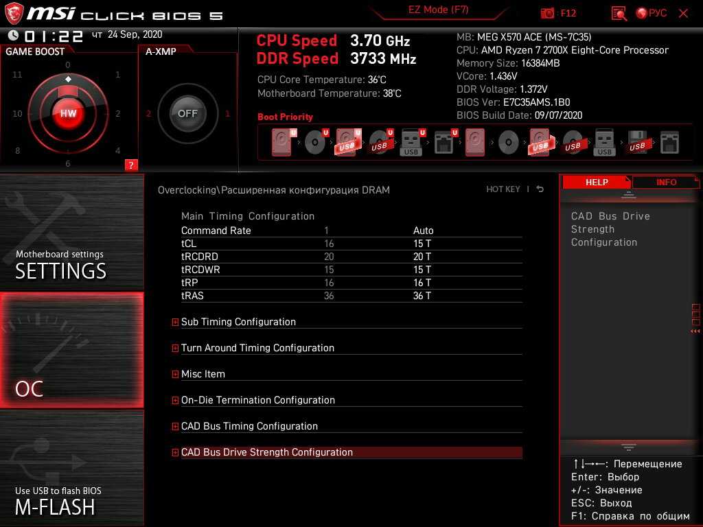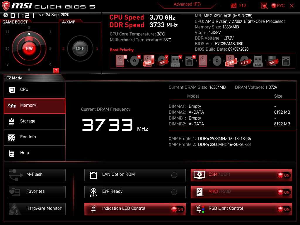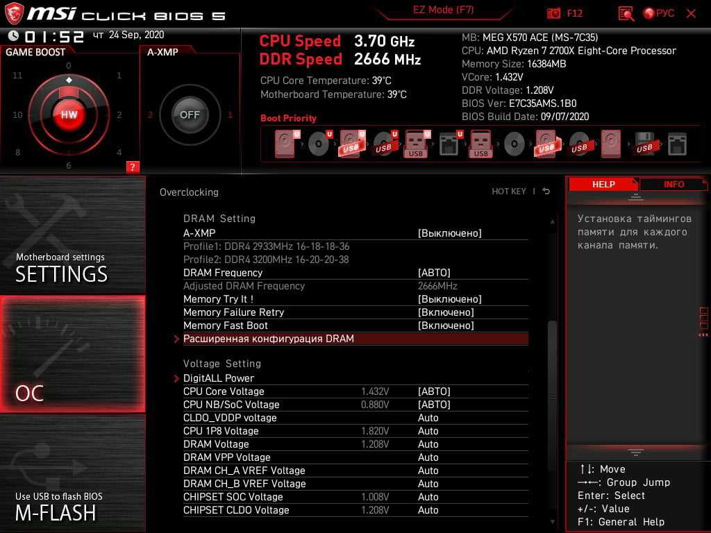 Активация XMP-профиля, который не некоторых платах под AMD называется D.O.C.P, запустила память при заявленных параметрах: DDR4-3600, 18-20-20-42, 1,35 В