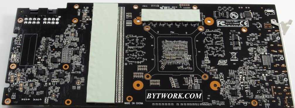 Отсоединив бэкплейт, мы видим, что к задней части видеокарты прикреплены термопрокладки, которые служат для дополнительного охлаждения памяти и VRM.
