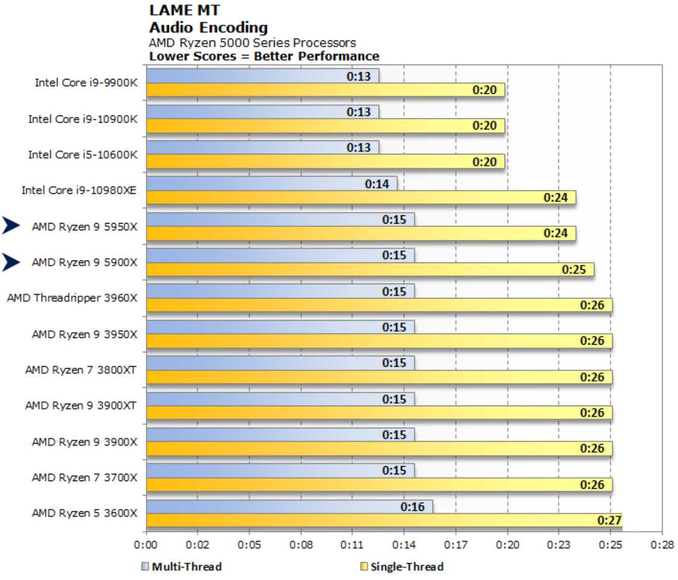 В этом тесте мы создали наш собственный WAV-файл размером 223 МБ и преобразовали его в формат MP3 с помощью многопоточного инструмента LAME MT ,в однопоточном и многопоточном режимах. Время обработки указано ниже в секундах. Более короткое время означает лучшую производительность.