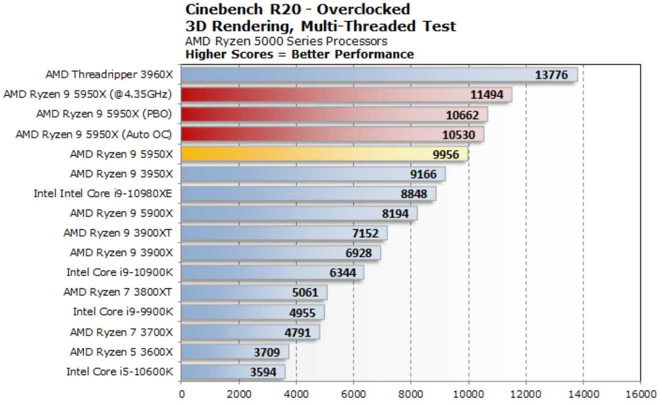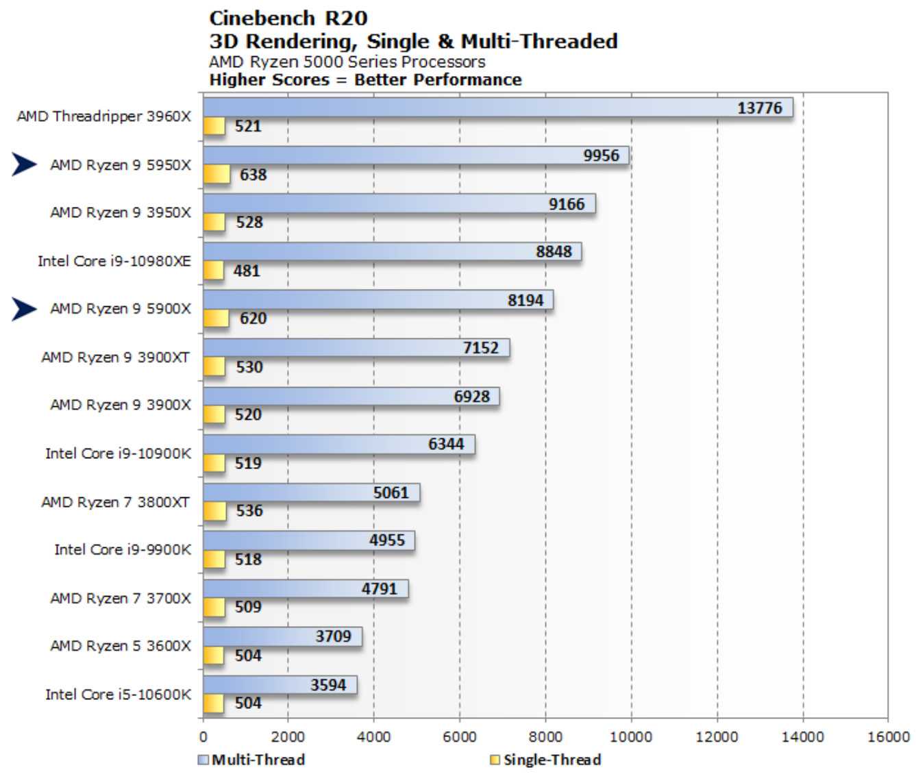 Ryzen 9 5900X и 5950X продолжают свою победу и в Cinebench. В этом тесте они не только обеспечивают лучшую однопоточную производительность, но и превосходное масштабирование многопоточности. Мы снова видим, что 16-ядерный Ryzen 9 5950X явно опережает 18-ядерный Intel Core i9-10980XE, а 12-ядерный Ryzen 9 5900X не слишком сильно отстает.