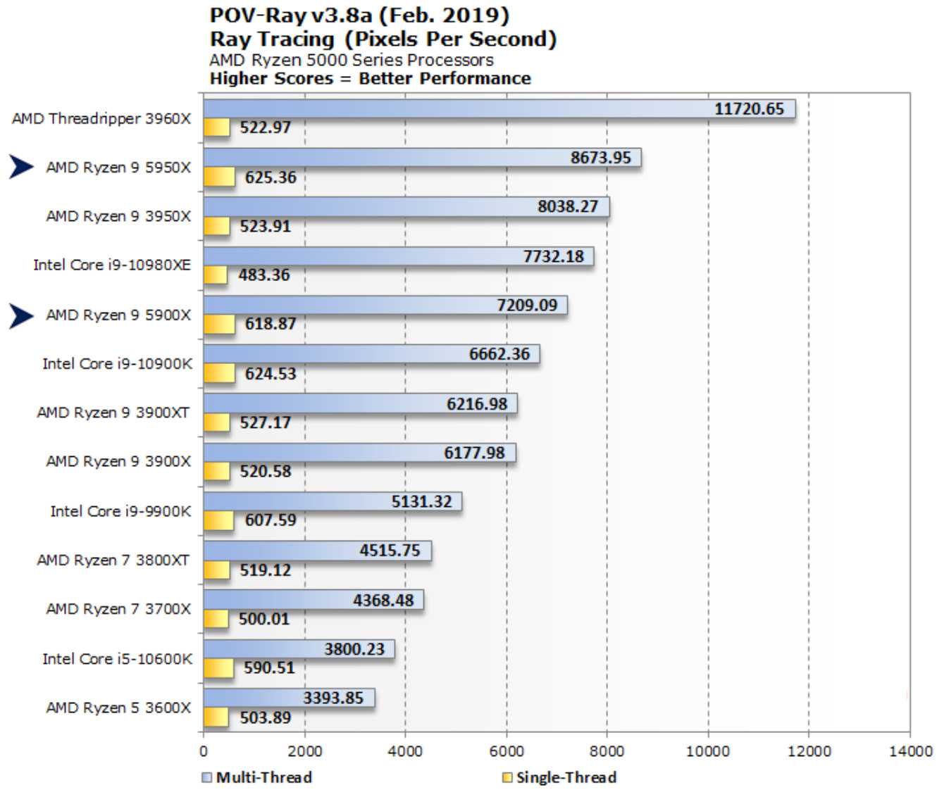 Тенденция к производительности в POV-Ray практически не изменилась по сравнению с тестами в Cinebench. Мы снова видим, что Ryzen 9 5900X и 5950X предлагают лучшие однопоточные показатели, а их сильное многопоточное масштабирование выводит их на первое место, опережая конкурирующие процессоры с большим количеством ядер (10980XE) или более высокими тактовыми частотами ( 10900K ).