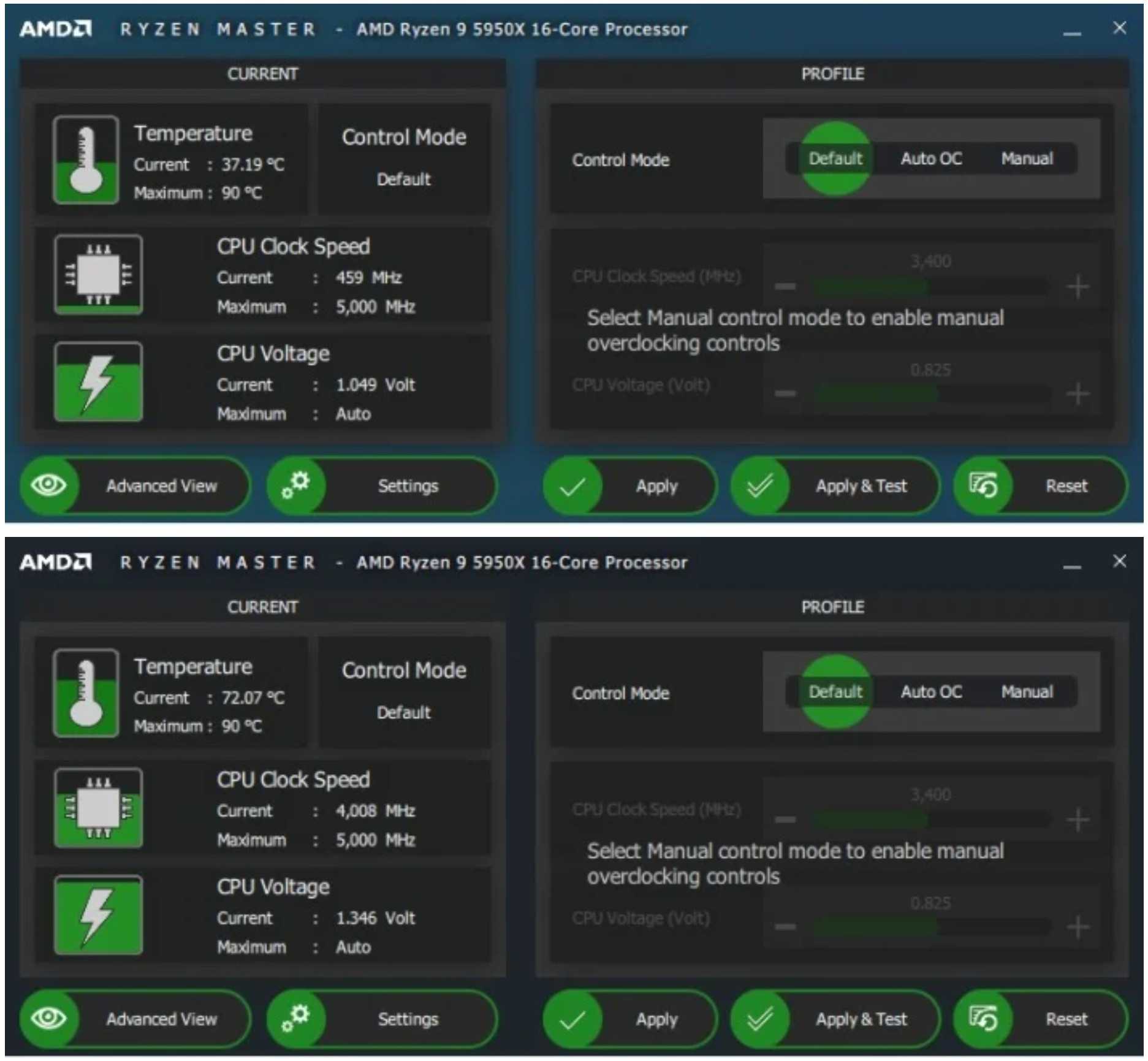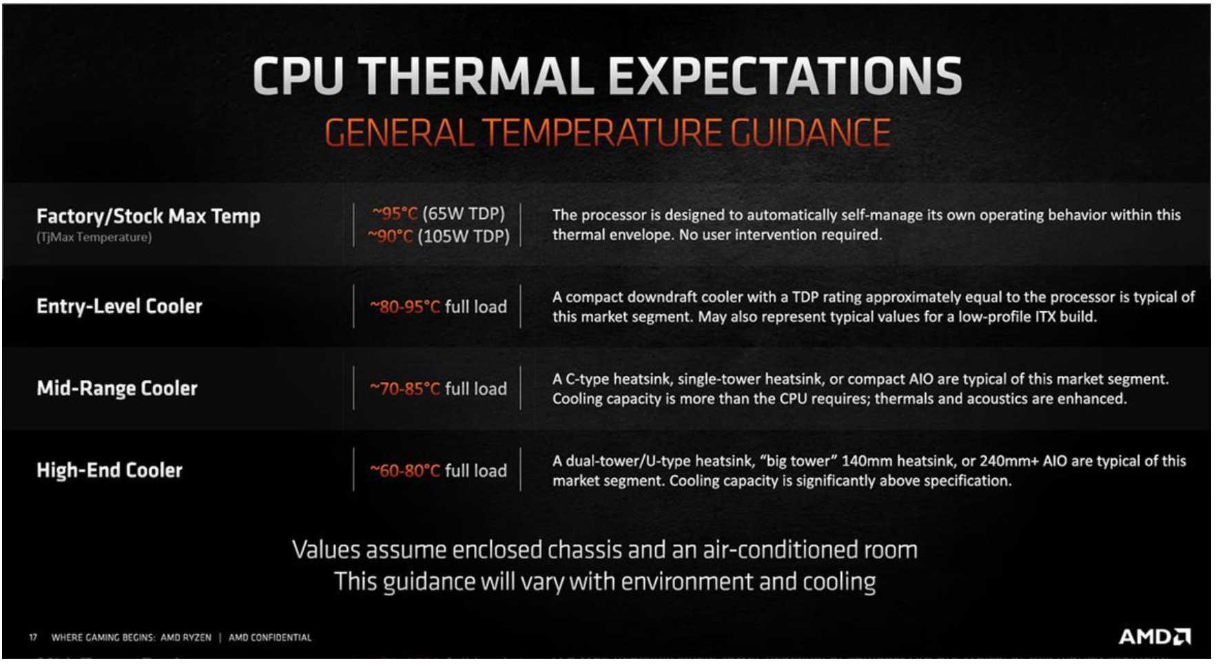 Процессоры серии Ryzen 5000 мощностью 65 Вт имеют максимальную температуру 95 ° C, а чипы более высокой мощности — 90 ° C. Как только эти температуры превышаются, процессоры будут самостоятельно её снижать, пытаясь снизить температуру, масштабируя частоты и напряжения, либо полностью выключать систему в экстремальных ситуациях.
