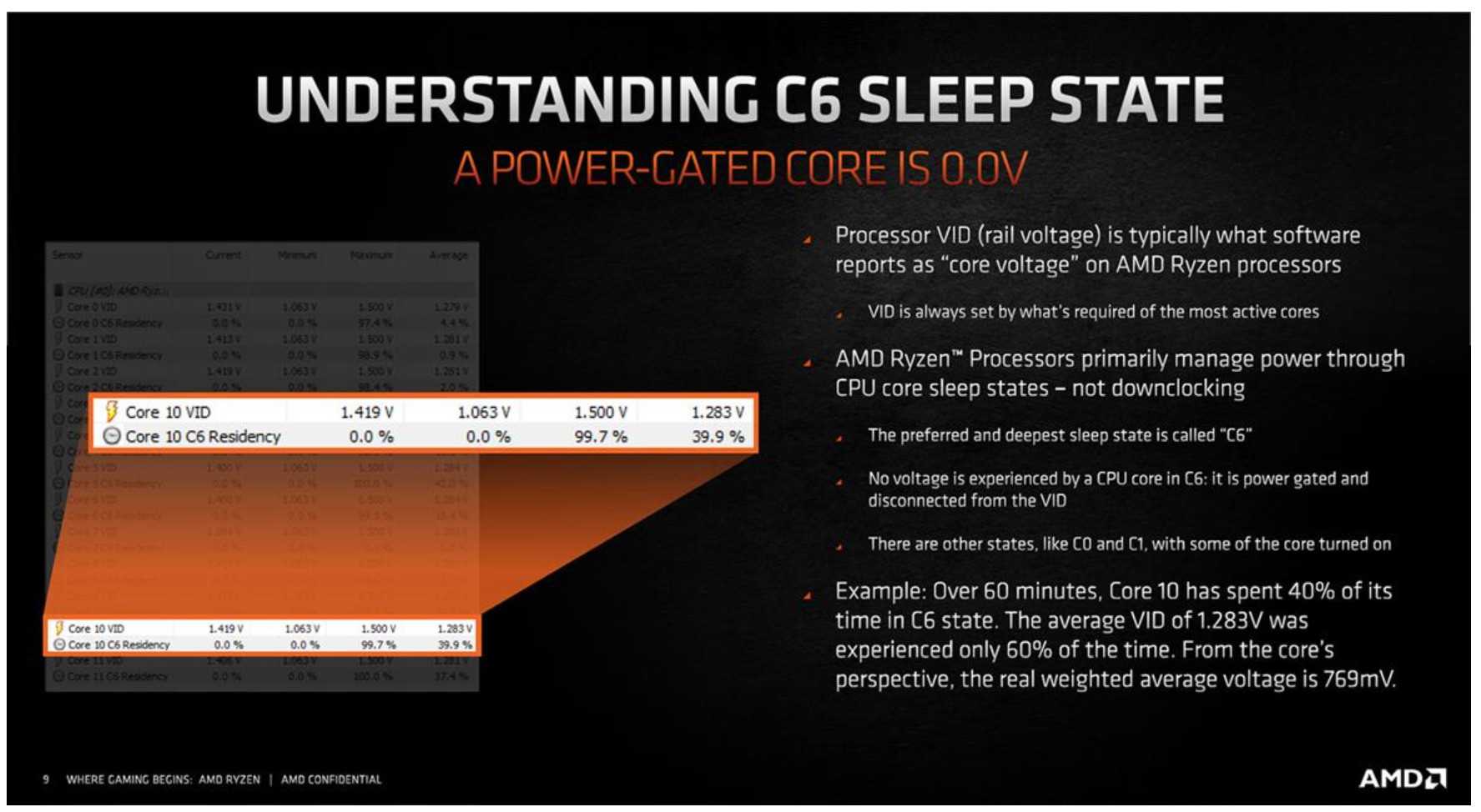 Говоря о мощности и температуре, AMD отметила, что ядра в процессорах серии Ryzen 5000 проводят значительное количество времени в состоянии глубокого сна C6, то есть ядро полностью простаивает, а напряжение падает до нуля. . Таким образом, среднее напряжение, сообщаемое некоторым программным обеспечением, может быть искажено и поазывать данные неправильно. В приведенном ниже примере мы видим , что в течение часа Core 10 проводит 40% своего времени в C6. Среднее напряжение было заявлено как 1,283 В, но с использованием внутренних показателей процессора и факторинга для состояния глубокого сна реальное средневзвешенное значение составило 0,77 В.