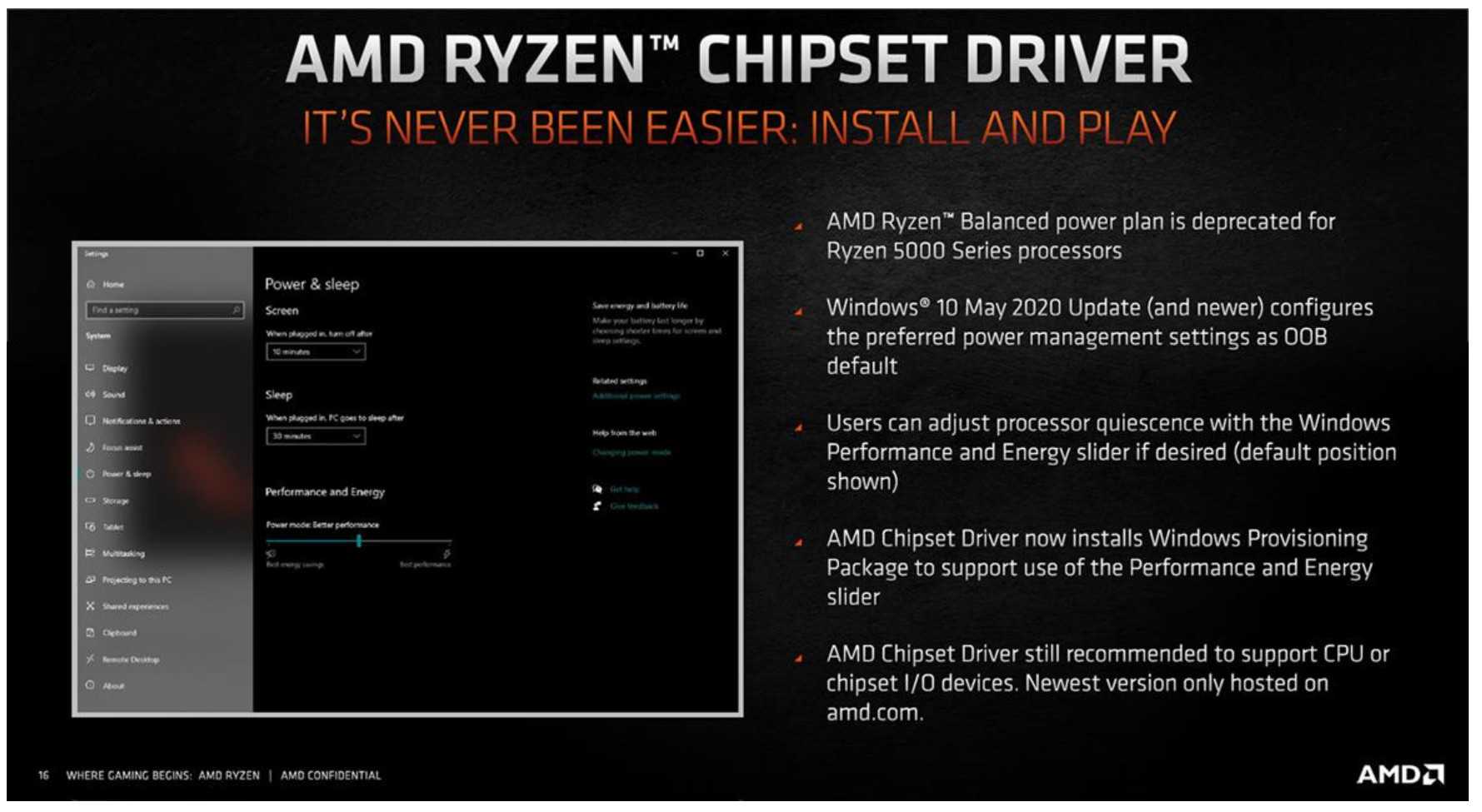 Есть и некоторые изменения в драйверах набора микросхем Ryzen. При условии, что в вашей системе установлено обновление Windows за 10 Maя 2020 (или новее). Новые драйвера теперь будут иметь возможность использование ползунка «Производительность и энергия». Если по какой-либо причине пользователи предпочитают состояние с низким энергопотреблением или более высокой производительностью, то для этого достаточно использовать ползунок, а не вручную изменять настройки схемы управления питанием и т.д.