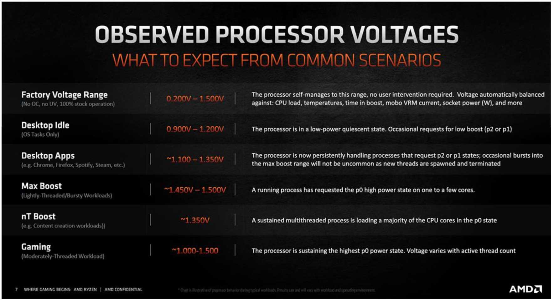 Как и все процессоры Ryzen предыдущего поколения, напряжения серии Ryzen 5000 будут увеличиваться и уменьшаться в зависимости от рабочей нагрузки и условий окружающей среды. Для этого AMD и предоставила некоторые подробности о том, чего ожидать при наблюдении за напряжениями серии Ryzen 5000 в различных условиях. Шкала довольно широкая и колеблется от 0,2 до 1,5 В, хотя самые высокие напряжения будут использоваться только в течение более коротких периодов времени во время периодов максимальной нагрузки. Типичное пиковое напряжение во время длительных многопоточных нагрузок должно колебаться около отметки 1,35 В.