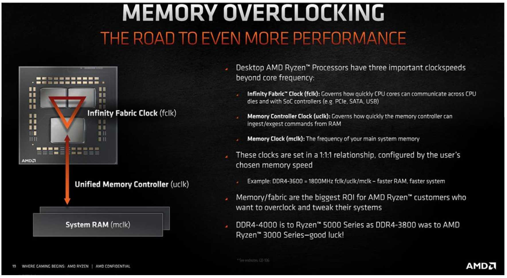 Infinity Fabric, контроллер памяти и тактовая частота памяти по умолчанию настроены в соотношении 1: 1: 1. По мере увеличения частоты памяти ,общая производительность увеличивается, а задержка уменьшается. С процессорами серии Ryzen 5000 AMD заявляет, что тактовая частота памяти DDR4-4000 должна быть достижимой при сохранении соотношения 1: 1: 1, тогда как на данный момент частота DDR4-3800 является высшей точкой для серии Ryzen 3000.