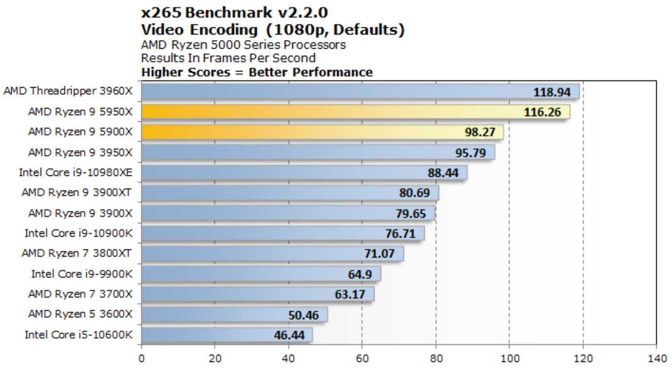 В тесте кодирования видео x265 Ryzen 9 5900X и 5950X показывают себя очень хорошо. Последние флагманы AMD для сокета AM4 опережают все, кроме высокопроизводительного Threadripper. Даже в этом случае преимущество 3960X над Ryzen 9 5950X невелико, особенно с учетом дополнительных 6 ядер первого и увеличения пропускной способности памяти.