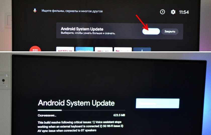 У меня, например, сразу после настройки появилось сообщение: «Android System Update». Это значит, что есть новое обновление Android TV для нашей приставки. Нажимаем на «Сведения», загружаем и устанавливаем обновление.