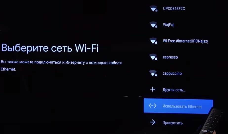 - Подключение к Wi-Fi. Следующим шагом является настройка через смартфон, но этот пункт можно пропустить. На следующем экране выбираем вашу Wi-Fi сеть и вводим пароль к ней. Если он стандартный, то нанесен на наклейку роутера. Здесь же можно подключиться и к проводному интернету.