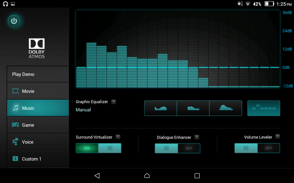 Приложение Dolby Atmos имеет простой и понятный интерфейс. Он точно такой же, как и у приложения Dolby Atmos на других устройствах. Имеется 3 основных режима и 1 настраиваемый пользователем режим. Режим «Динамический» обеспечивает адаптивное качество звука в зависимости от окружающей обстановки. Режим «Кино» идеально подходит для ваших фильмов и телепередач, автоматически регулируя низкие и высокие частоты для более четкой речи. Режим «Музыка» обеспечивает более живое и реалистичное звучание музыки. А режим «Custom» имеет большой эквалайзер, который может выбрать пользователь. Пользователь сам настраивает аудиочастоты.