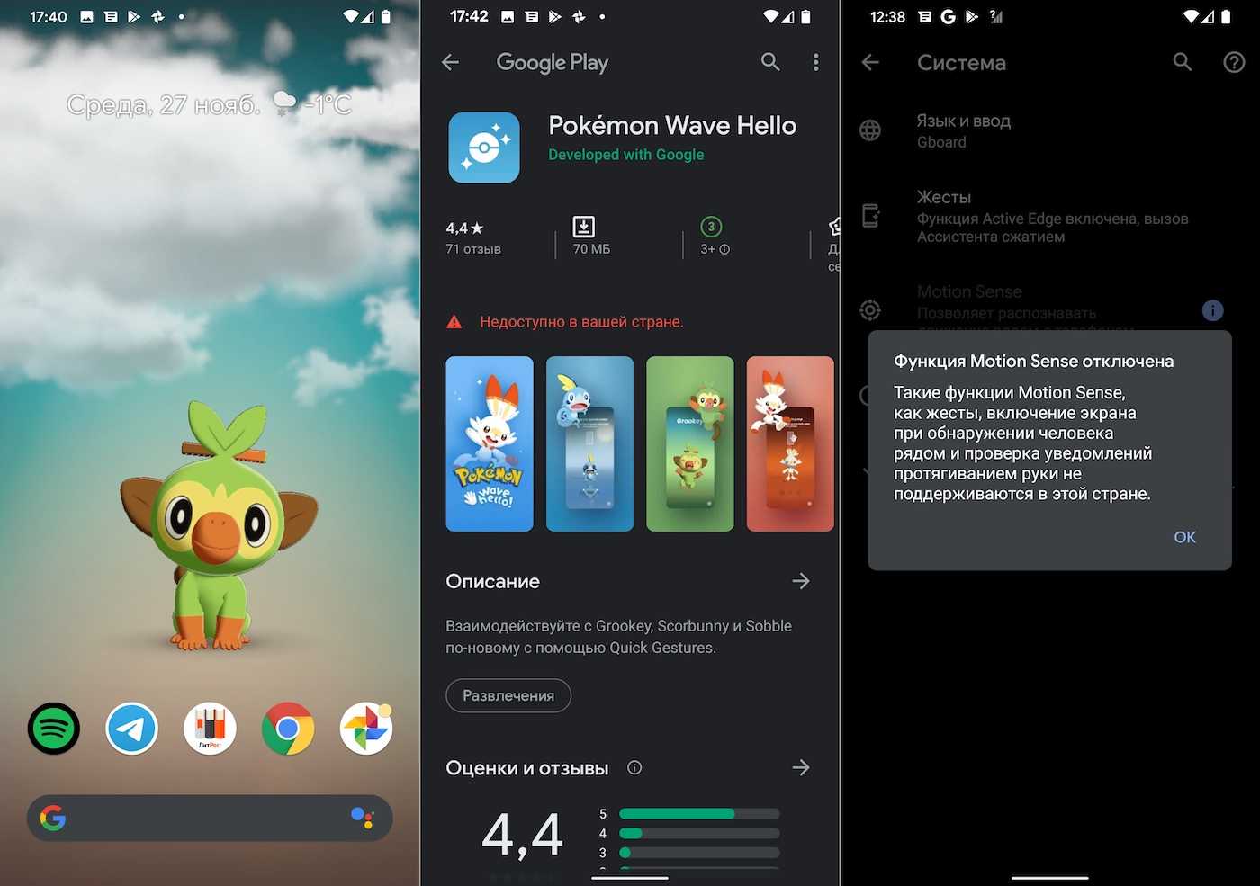 Телефоном можно управлять, не касаясь экрана, используя функцию Motion Sense. С помощью датчика Soli телефон следит за действиями ваших рук, так можно отключить будильник или листать треки в плеере, когда включён дисплей, проводя над ним ладонью. В России, к слову, функция не работает, о чём предупреждает смартфон. Поэтому, к сожалению, поделиться личными впечатлениями о её использовании не смогу. Зато можете посмотреть маленький ролик, где показано, как будет меняться привычный сценарий использования устройств: