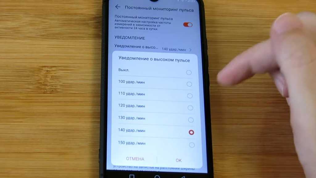 Постоянный мониторинг пульса можно активировать в настройках приложения. Там же можно установить порог пульса, после превышения которого браслет уведомит вас (возможна установки и нижнего порога).
